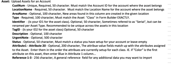 CustNum - Unique, Required, 50 character. Must match the Account ID for the account where the asset belongs