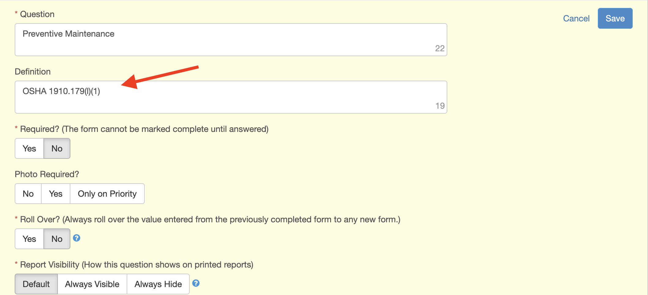 Report Visibility determines if a question on a form template will always show on the report, always be hidden on a report, or will follow the default logic set up with the folder settings based on the priority level.