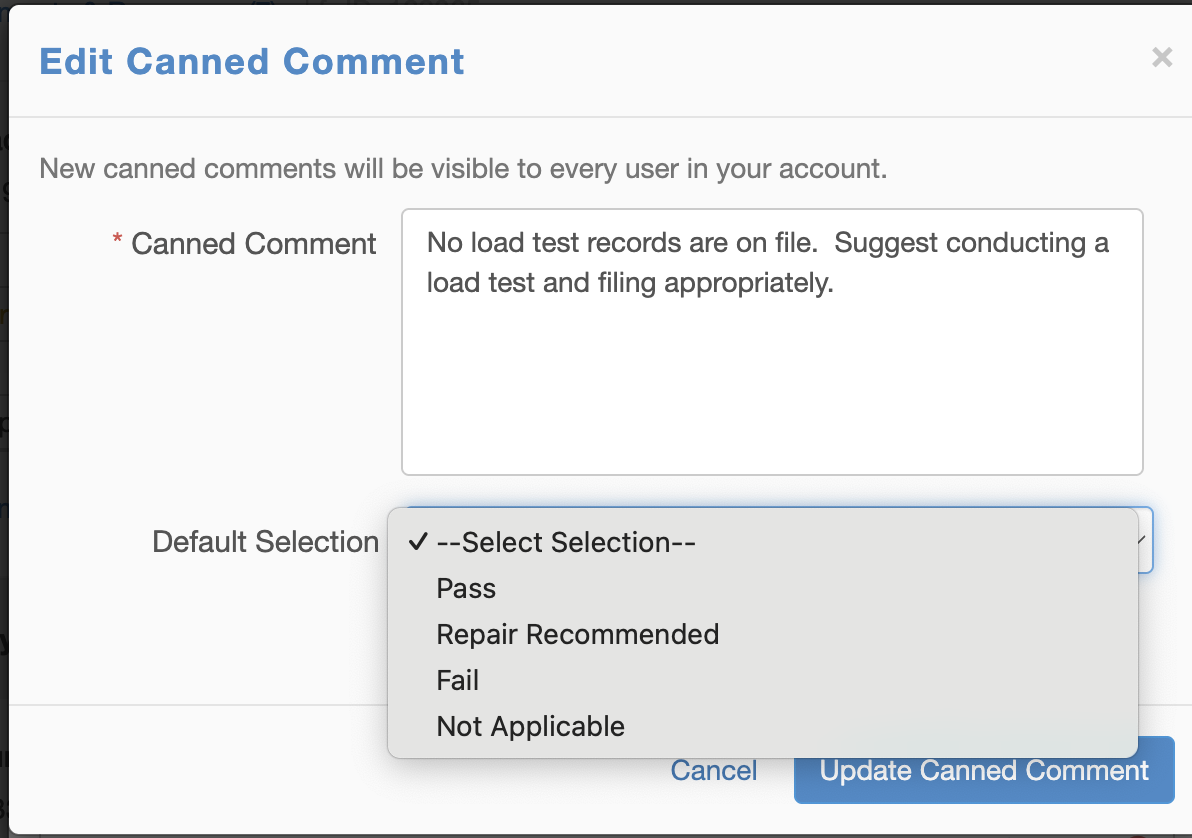 For instance, you can set up a canned comment of "No Load test records are on file" and when that comment is selected from the canned comments within the question on the mobile app or website, it will answer the question with the default of "Fail" for the answer selection.