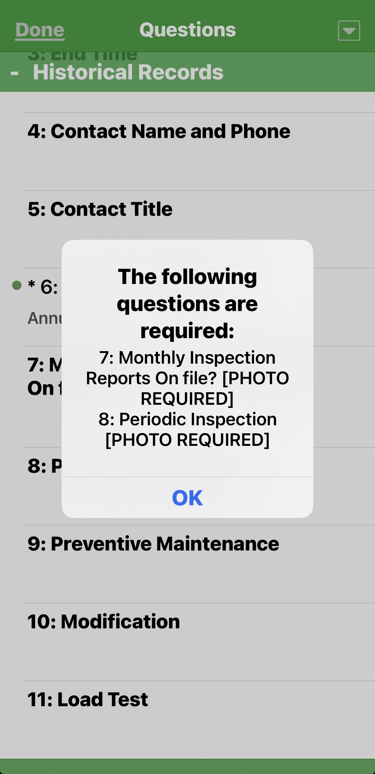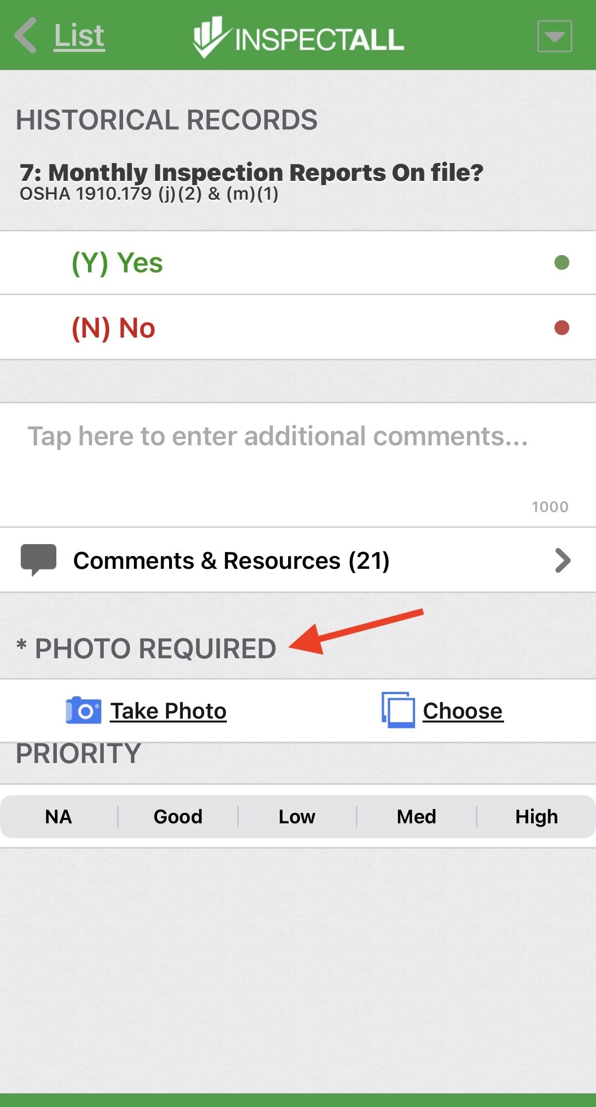 There are some questions that are absolutely essential to ensuring your workflow is effective. For just such questions, InspectAll has included a setting that makes questions required. You also have the ability to make it required to add a picture to a specific question, either all the time or only when a priority level other than "good" or "n/a" have been answered on the question. Once a question or pictures are marked as required, the user will not be able to mark a form complete until all of the required questions are answered and/or pictures are taken.