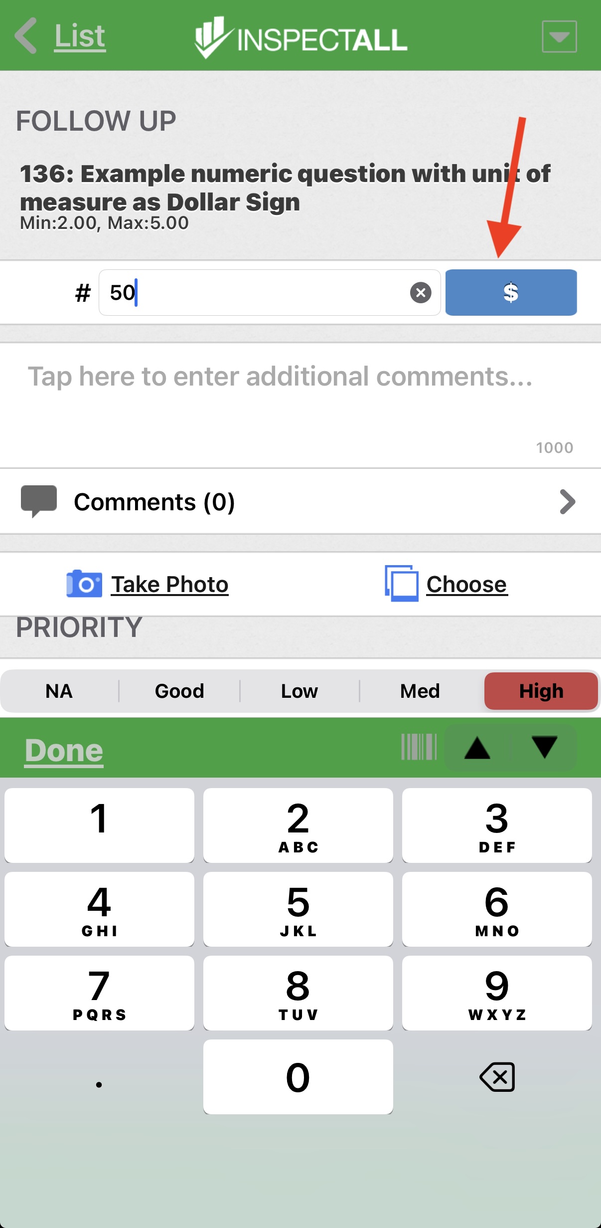 Number questions only allow numbers as their answer. Add a number question if you need to capture a number or measurement. You can also set up Units of Measure that allow mobile users to pick a selection on the app.