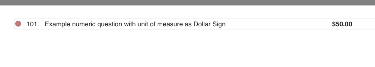 If you have multiple units of measure entered as options for that question, the user will need to select the dollar sign to have the number format to currency. If that is the only unit of measure you enter for the question, then it will automatically format to currency in the report download using the $ and two decimal places.