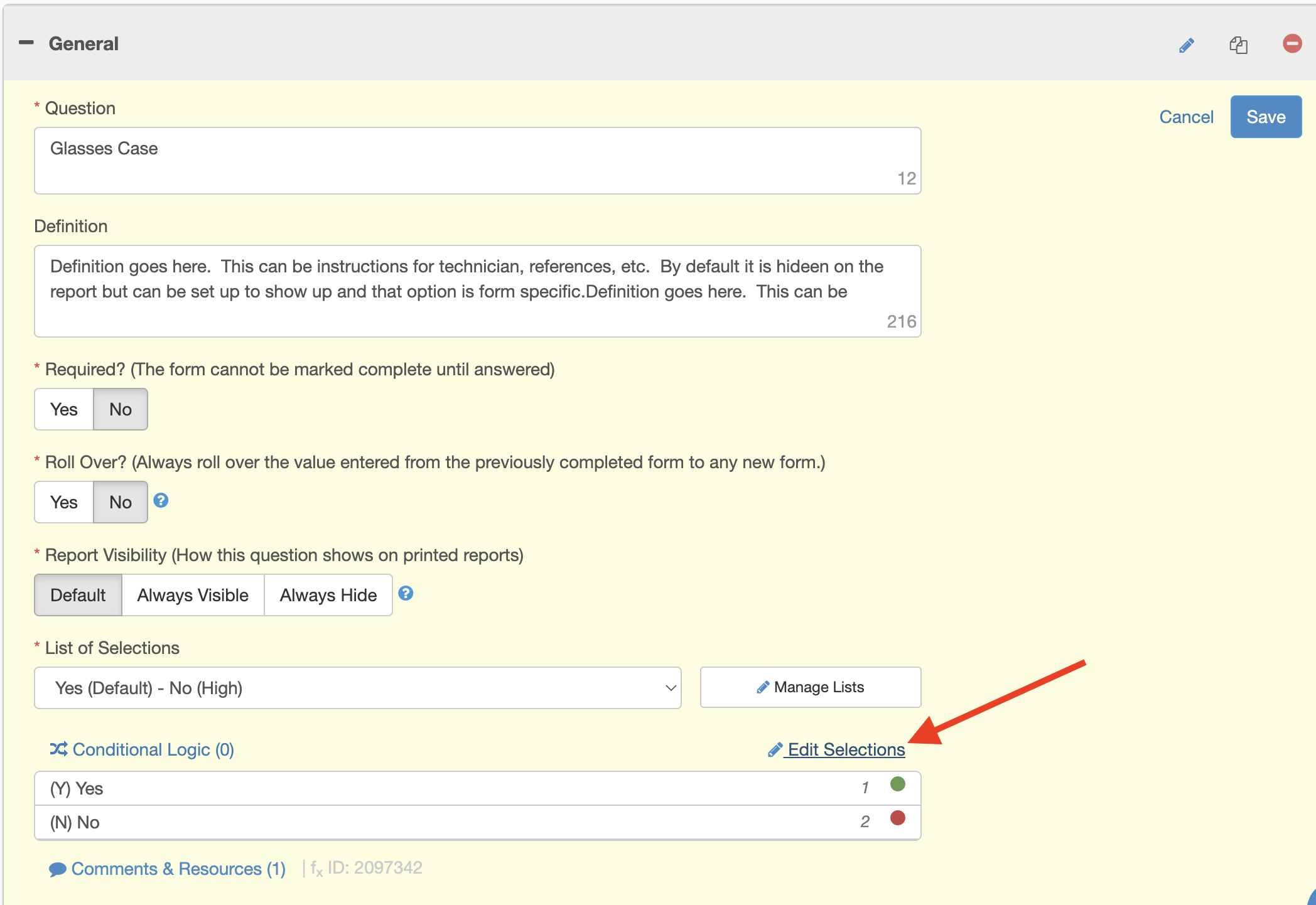 IMPORTANT NOTE: If you are editing an answer selection list that has already been used on completed forms, you will want to make sure you are adding and removing new answer options (instead of typing over existing selections). If you type over the existing selections, it will change the answers you selected on previously completed forms. So only write over an existing answer selection if the meaning of that selection stays the same. For instance, if you want to change a selection from "Pass" to "Acceptable".