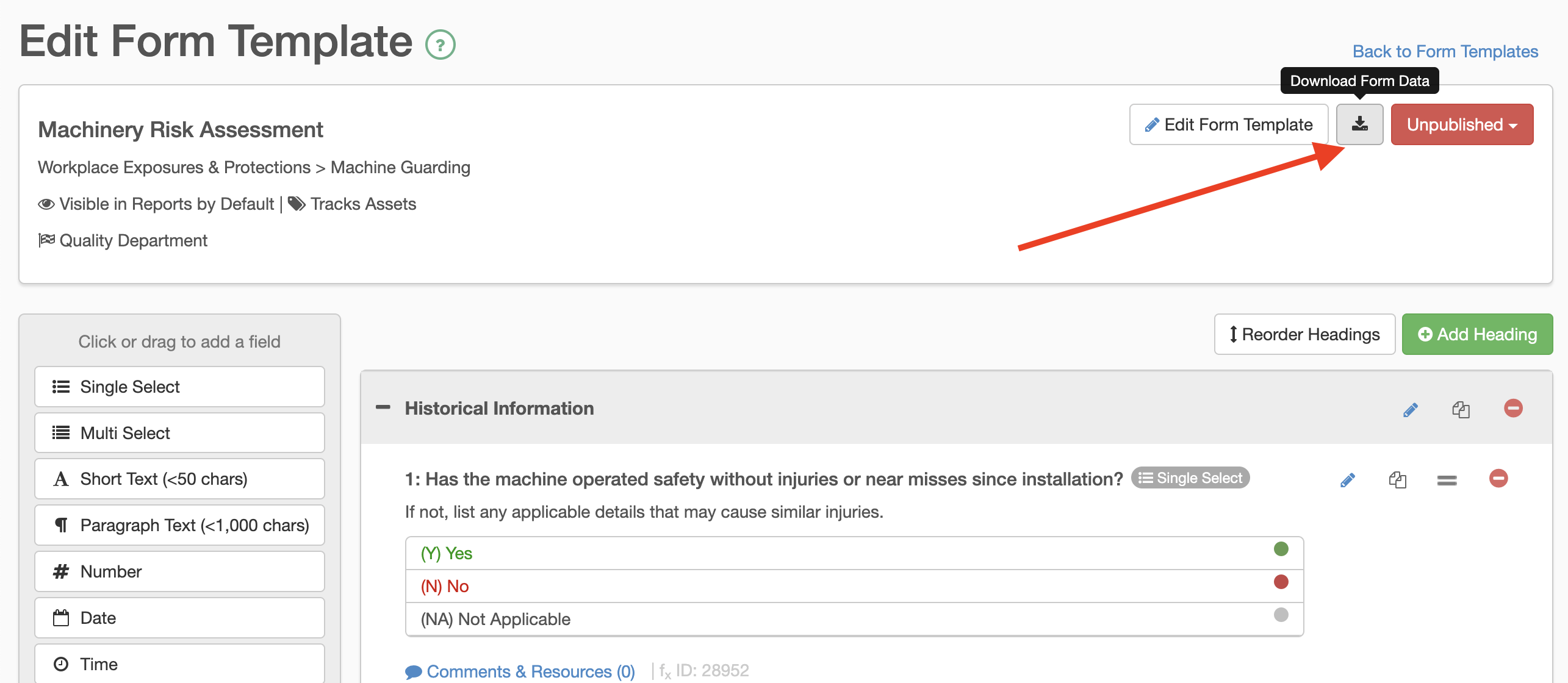 You can download a report from the Form Builder for each Form. This creates an excel export of the Form.