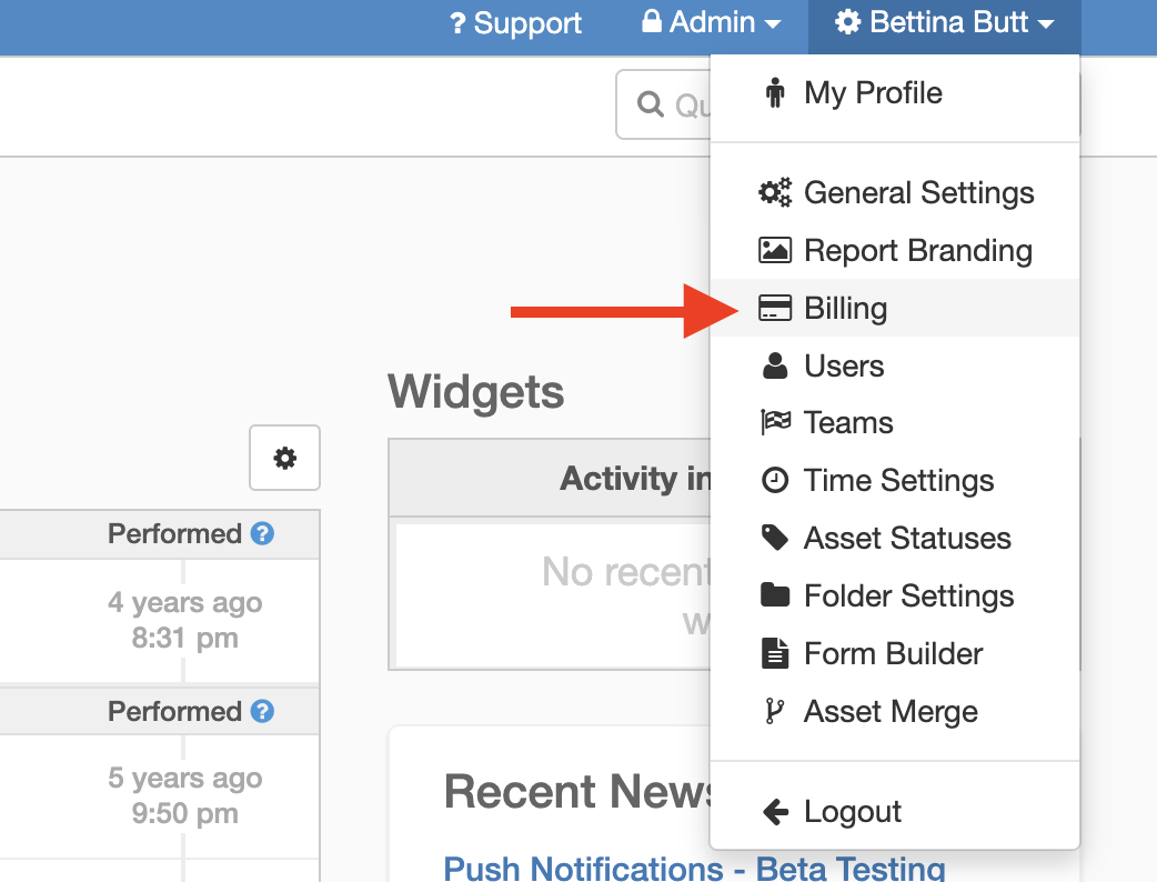 - Click "Billing" on the drop down menu under your name on the InspectAll website.