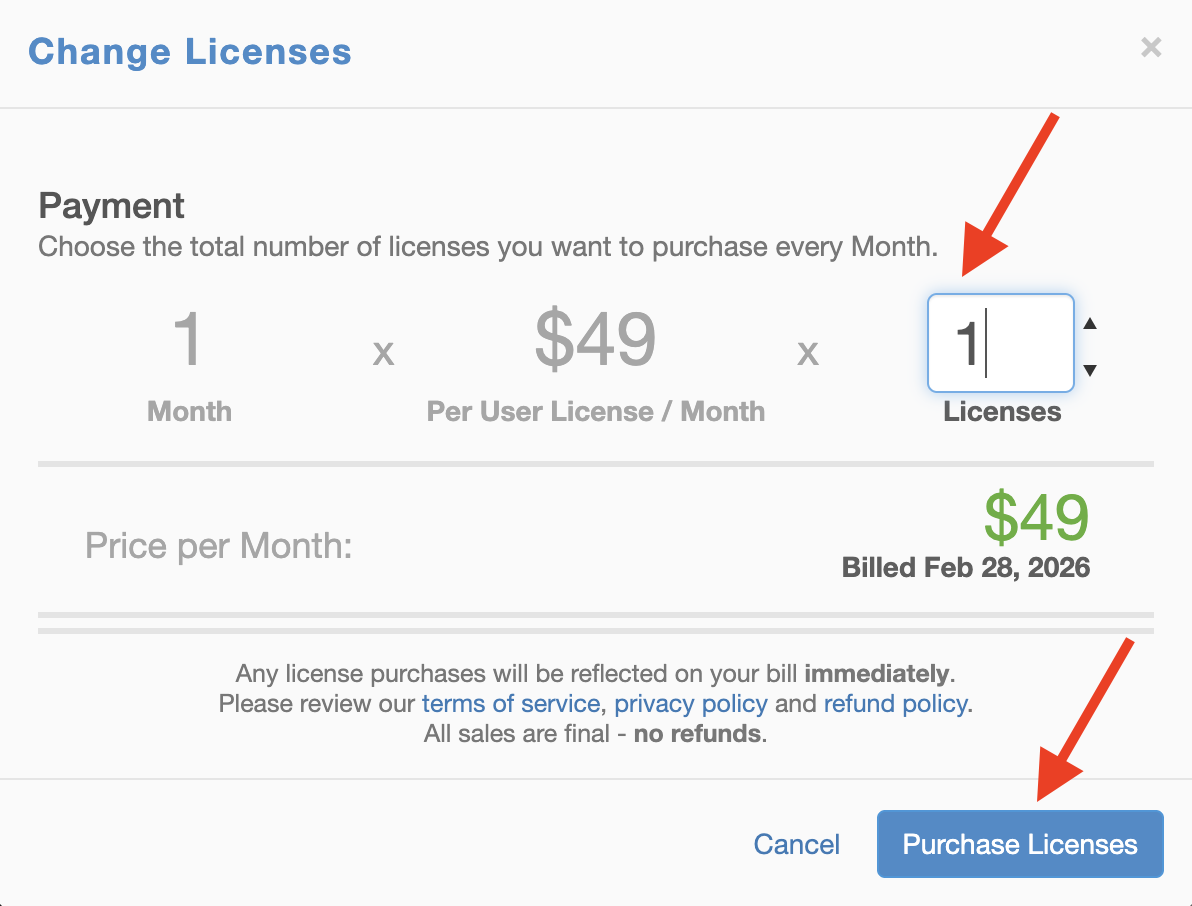 - Click on "Purchase Licenses" to complete the purchase of the additional licenses.